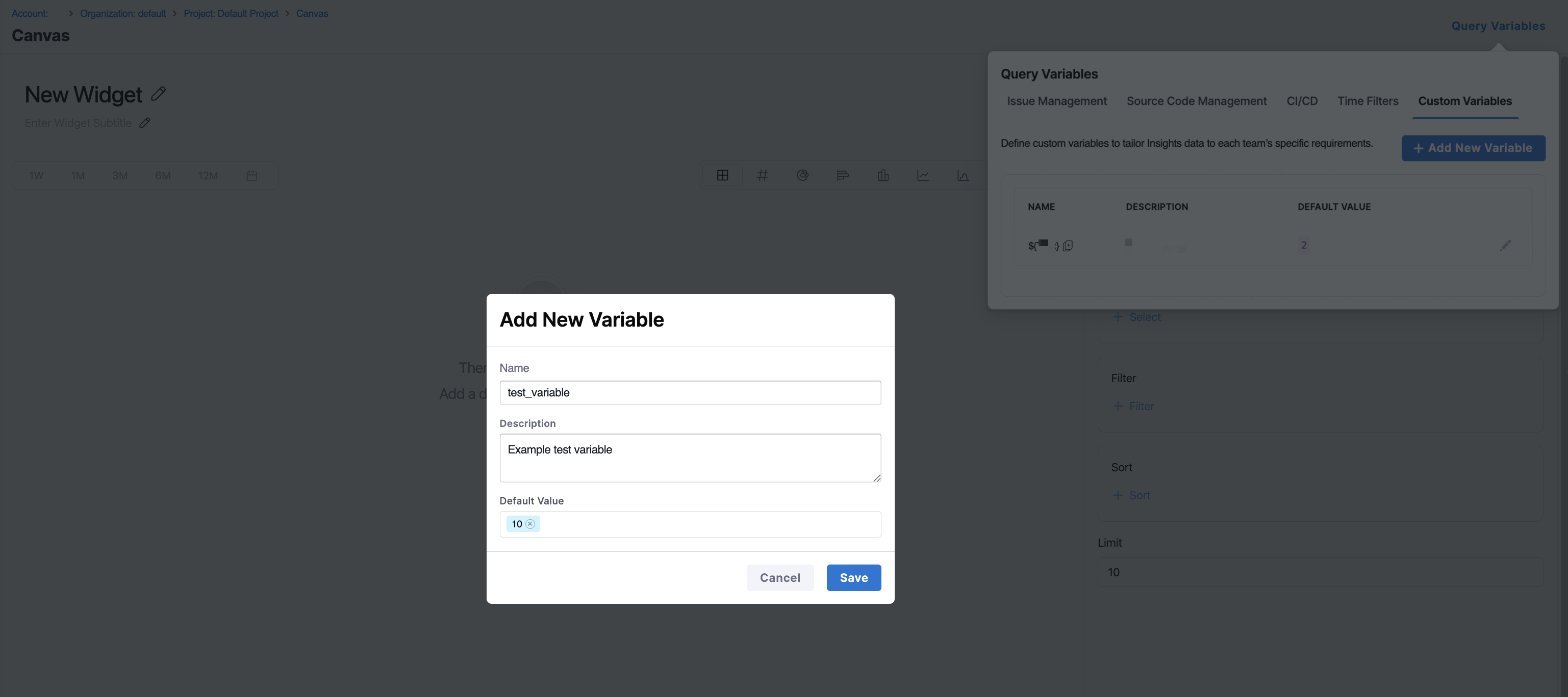 Canvas dashboards support query-level variables, including team-scoped filters and custom variables. This allows dashboards to dynamically adapt based on your configuration in Team Settings.