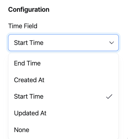 Click the Settings icon to configure how time is applied to your data. You can select a time field (such as Created At, Start Time, End Time, or Updated At) to control how the dashboard filters data.