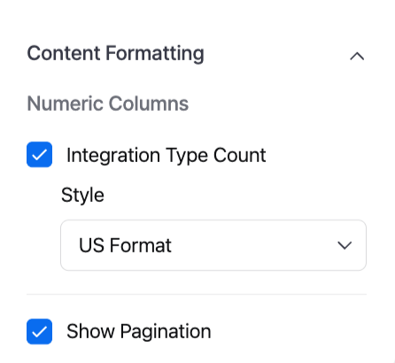 Additional options under Content Formatting allow you to customize how results are displayed, such as enabling pagination by clicking Show Pagination or formatting numeric columns based on selected aggregations. When you enable a column in the Numeric Columns section (for example, Integration Type Count), you can configure a style to control how values are displayed.