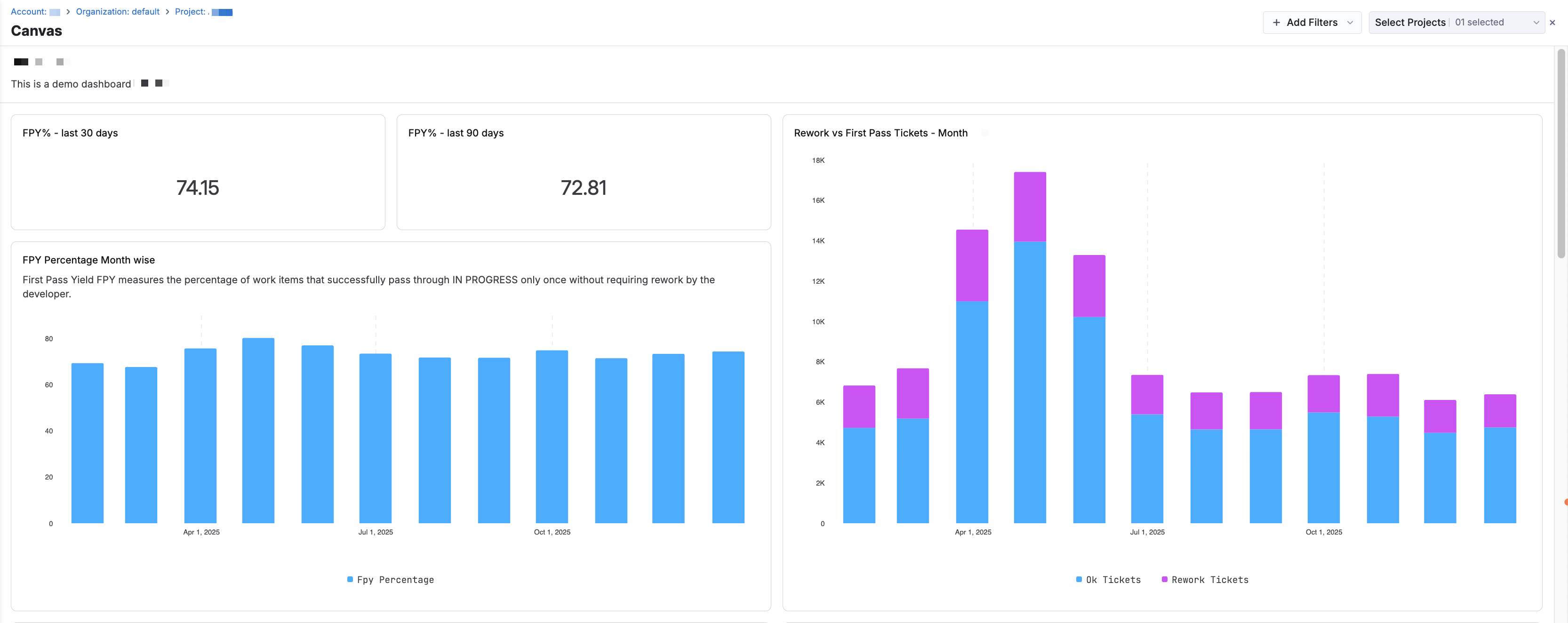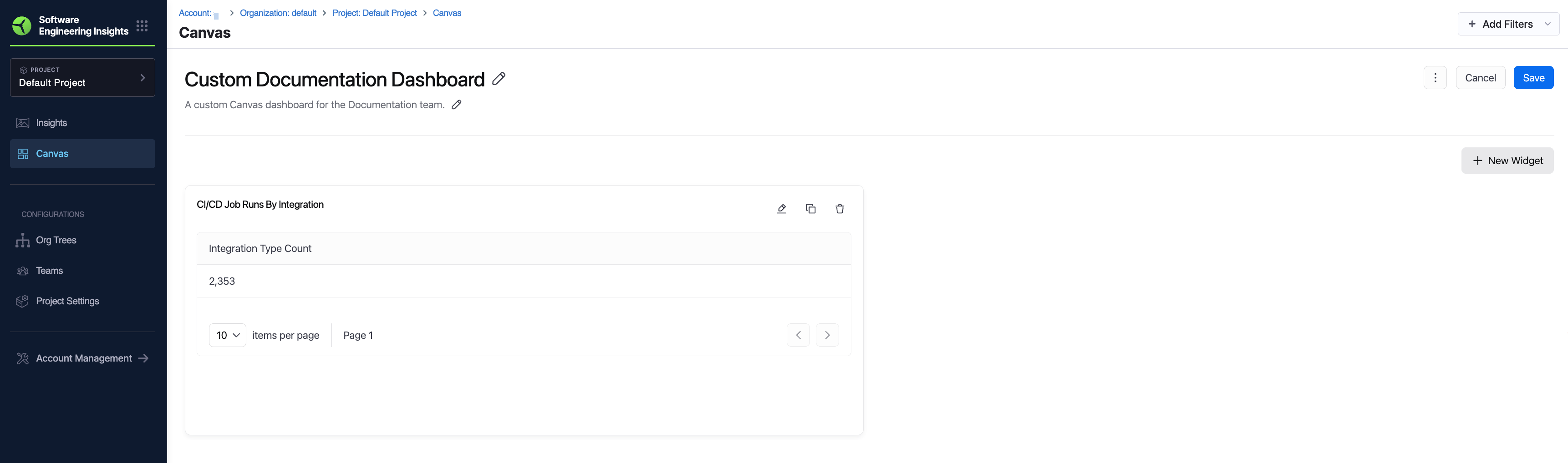 Navigate to the Canvas page to create and manage custom dashboards that appear on the Insights page in SEI 2.0. If the out-of-the-box dashboards on the Insights page does not provide the views your team needs, you can create custom dashboardsA user-created dashboard built in Canvas and published to the Insights page for viewing and sharing. It can be tailored to display the most important data for your use case, providing insights and facilitating decision-making. on the Canvas page to publish, share, and collaborate with your team.