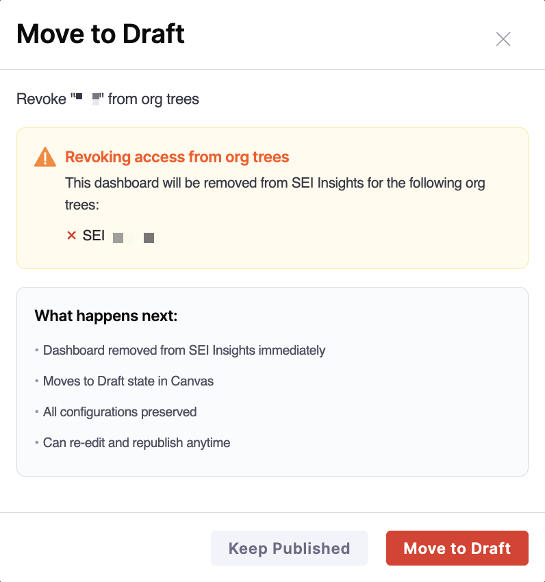 • Move to Draft: Reverts a Published dashboard back to Draft state for further editing. When selected, a confirmation modal displays the Org Trees the dashboard is currently associated with.