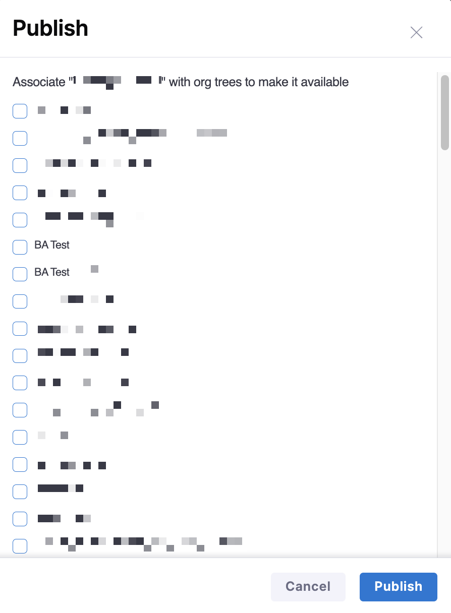 When you click Publish, you are prompted to associate the dashboard with one or more configured Org Trees. You can select multiple Org Trees, then click Publish to confirm. This association controls how the dashboard is scoped and viewed across teams, rather than granting direct access permissions.