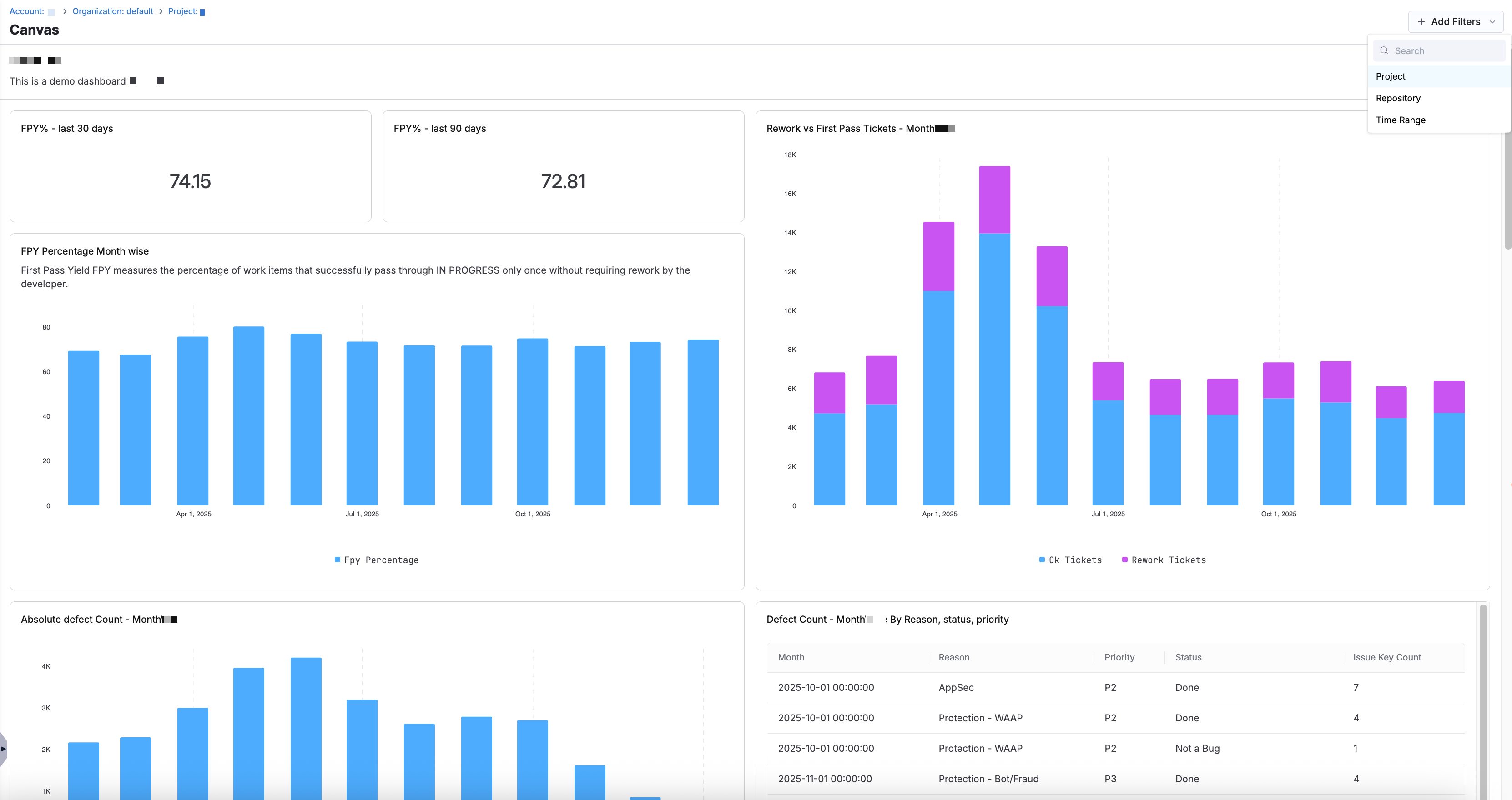 Once you edit or create a dashboard, you enter a Dashboard Editor view where you can customize your dashboard layout and add widgets. To apply dashboard-level filters, click the + Add Filters dropdown menu and select Project, Repository, or Time Range.