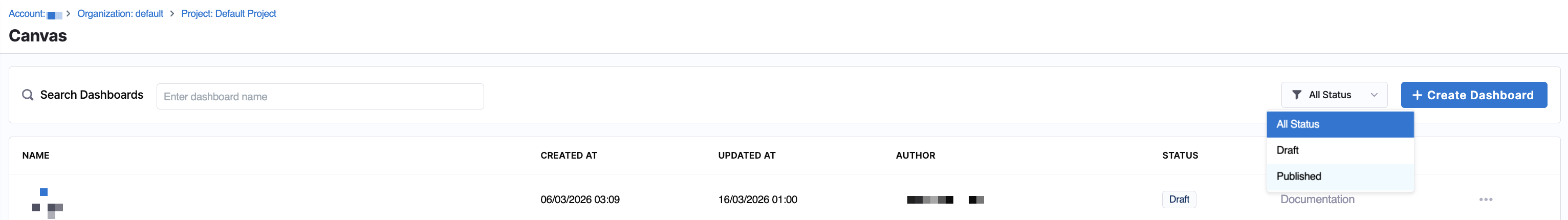 Published Canvas dashboards are read-only. To make changes, move the dashboard back to Draft, update it, and then publish it again. For more information, see Managing dashboards in Canvas.