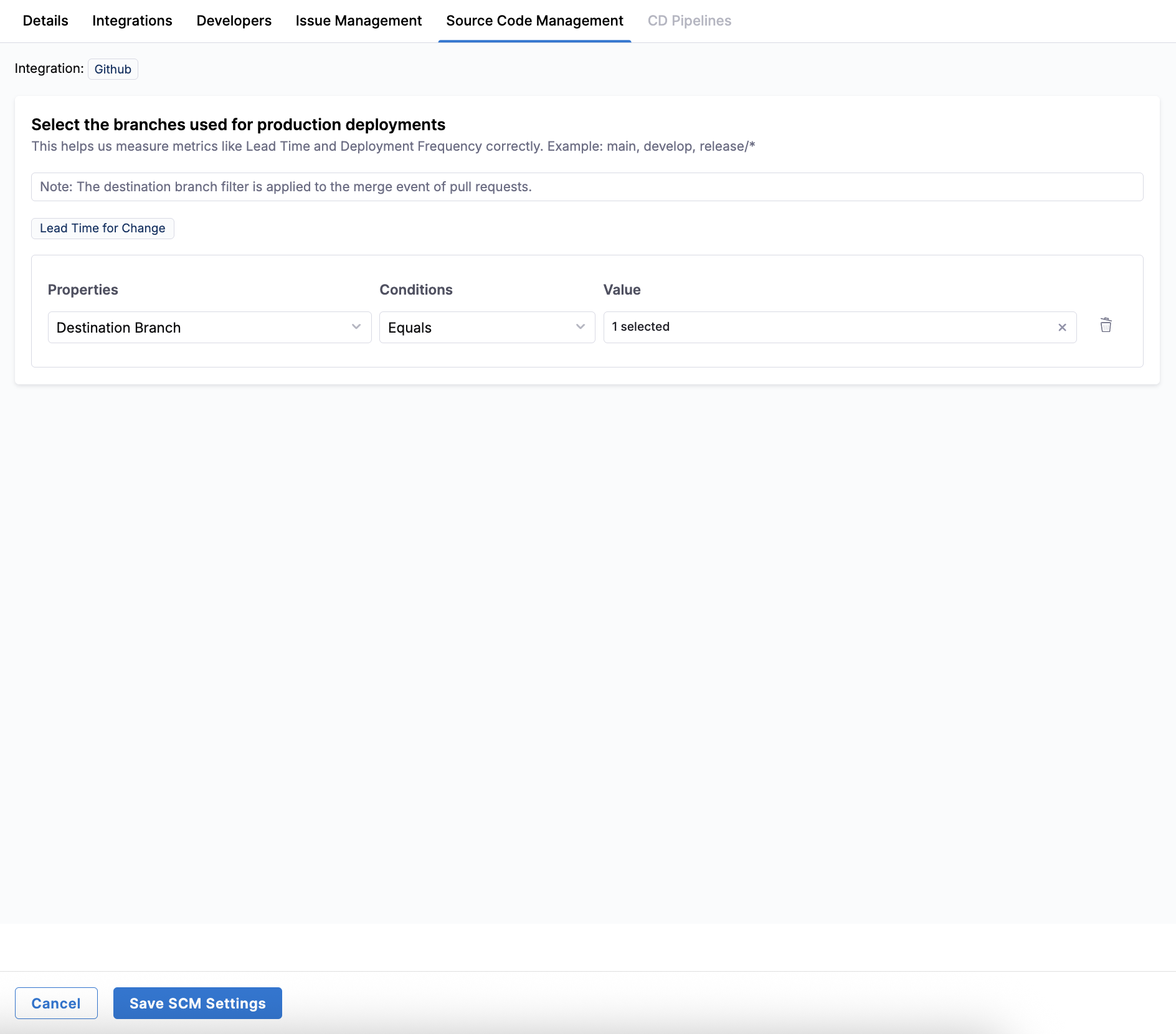 Use the Source Code Management tab in Team Settings to define which branches are relevant for your team's delivery metrics, such as production deployments and Lead Time for Change.