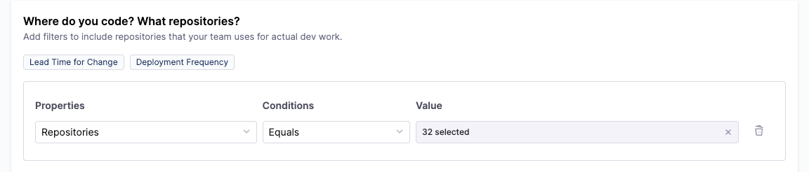 You can add multiple filter sets by clicking + Add Condition. Each additional filter set is combined using AND logic, meaning all filter sets must match for a work item to be included. To remove a filter set, click the Delete icon next to it. Depending on the profile applied to the team, this configuration can impact delivery, reliability, productivity, and business alignment metrics.