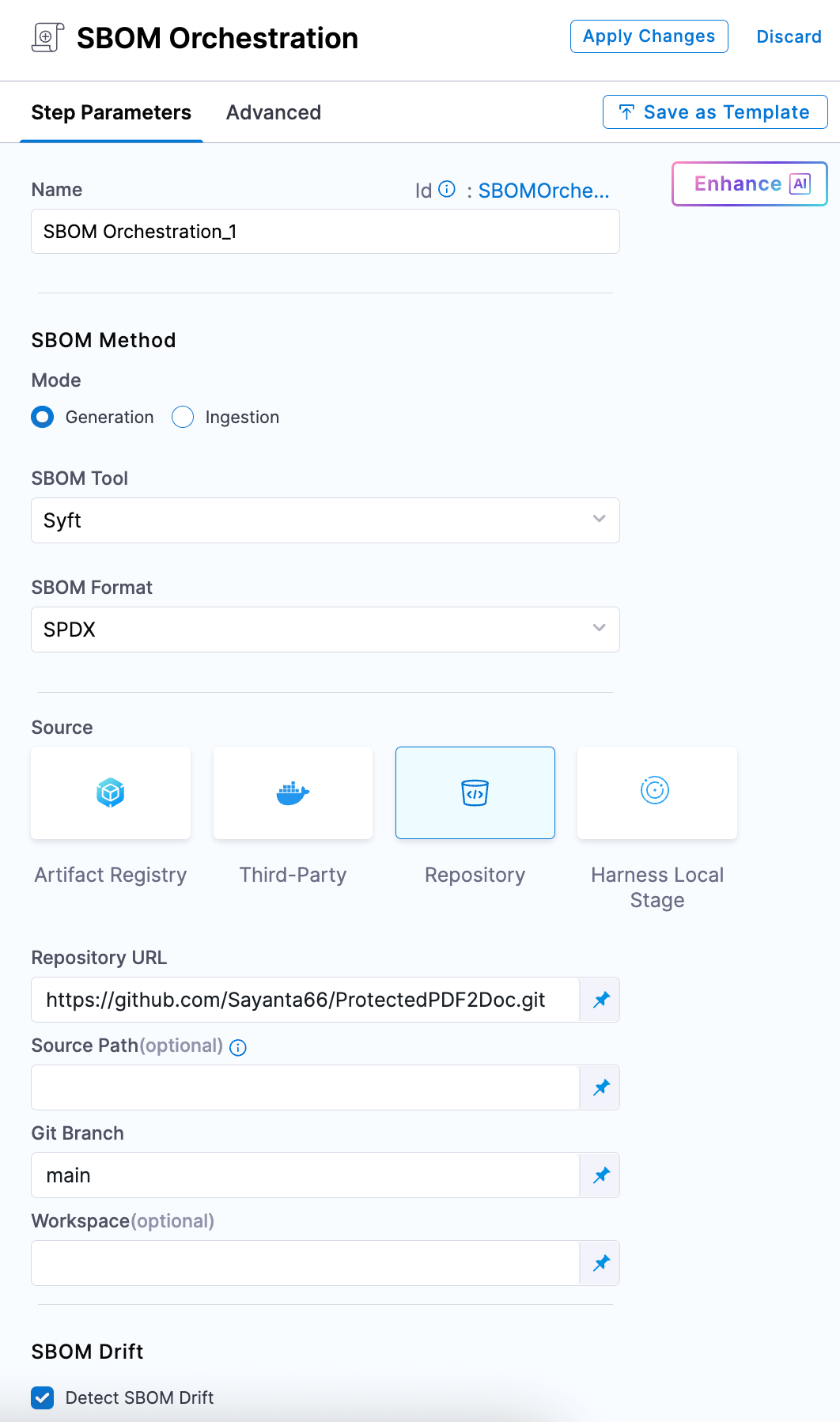 Using SBOM Orchestration step you can generate the SBOM for both Container images and Repositories. Follow the steps to configure the fields for each supported type.