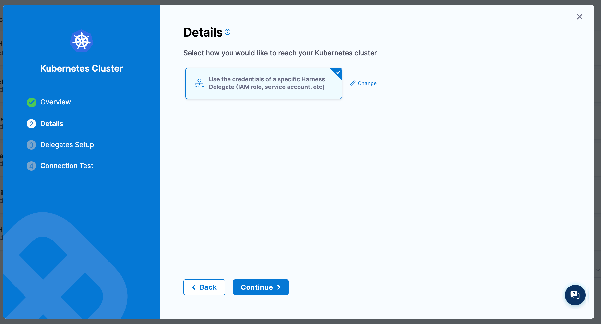 Select Use the credentials of a specific Harness Delegate (IAM role, service account, etc) as our connection method.